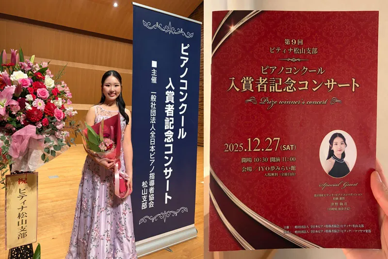 2025特級銀賞・津野絢音さんは、2025年末の12月27日、愛媛県の松山支部の入賞者記念コンサートにて初のゲスト出演を果たしました。津野さんにとって初の四国上陸でもありました。松山支部からのレポートと津野さんからのメッセージをお届けします。