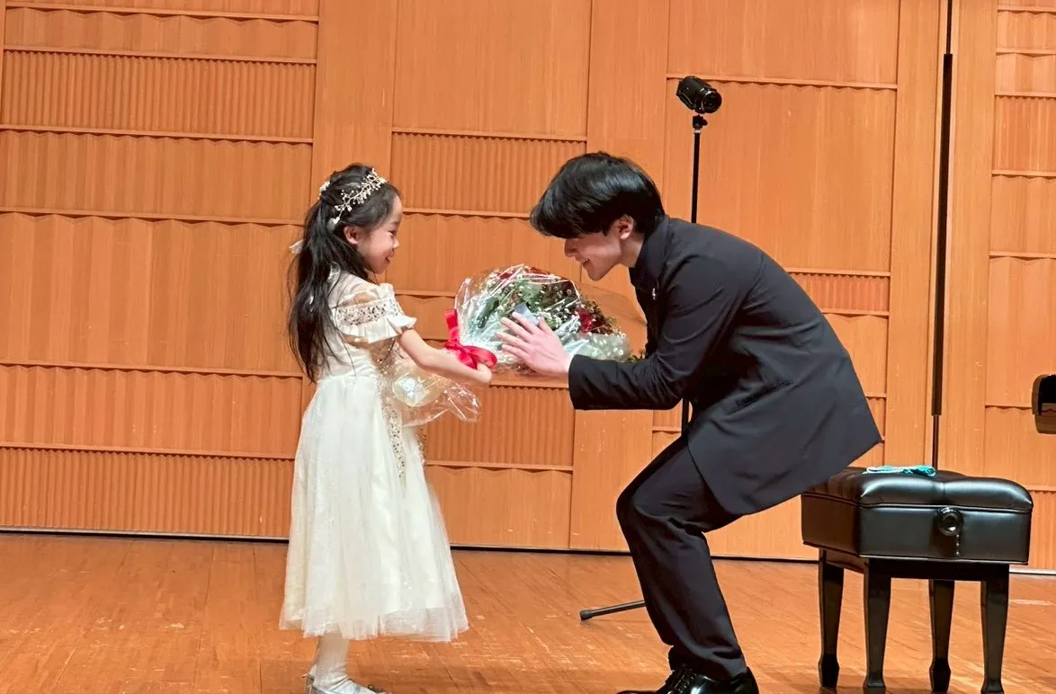 最後に私の出番となり、スカルラッティ、ショパン、ブラームスの20分程のプログラムで演奏させていただきました。皆さまとても真剣な眼差しで聴いて下さり、とてもうれしかったです。そして、1番小さな生徒さんが花束を手渡し下さり、可愛らしさにとても癒されてしまいました。アンコールでは、ショパンの練習曲Op.12-12「大洋」を演奏させていただき、皆さまからとても温かい拍手をいただきました。