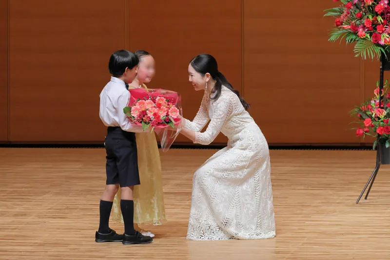 演奏後には、出演者を代表して子どもたちからゲストのお二人へ感謝の花束を贈呈しました。ステージ上での堂々とした姿から一転、舞台袖に戻ってきたお二人は、子どもたちの目線に合わせて優しく語りかけてくださる姿が非常に印象的でした。