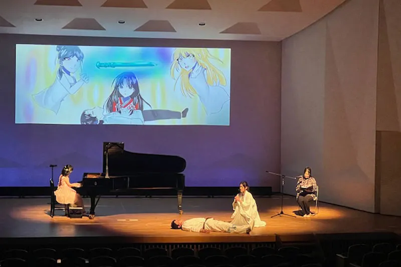 第3部は12組24名の会員の先生方の生徒さんが、大政直人先生作曲の朗読と連弾による組曲『八神姫と大国主命の物語』を、今年は演劇も入れて、皆で力を合わせて表現しました。
