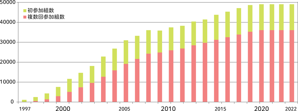事業開始以来、参加組数が年々増え続けているステップ。現在では、全体の約7割の参加者が複数回ステップのステージに立っており、うち9,300組以上が継続表彰を受賞しています。近年では、「継続100回」の大台を超える参加者が年に複数名現れるようになってきました。